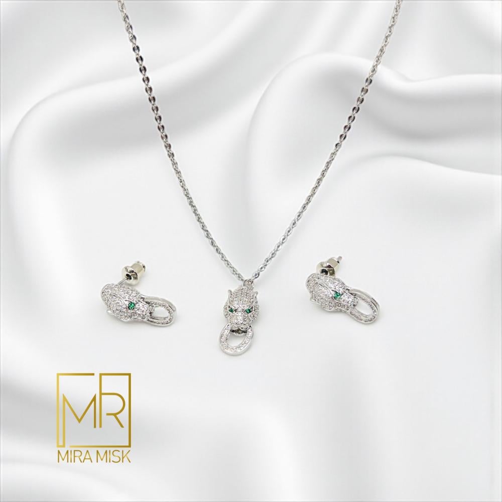 - الأحجار: زركون (Cubic Zirconia) شفاف بأسلوب pavé + تفاصيل زركون أخضر للعينين