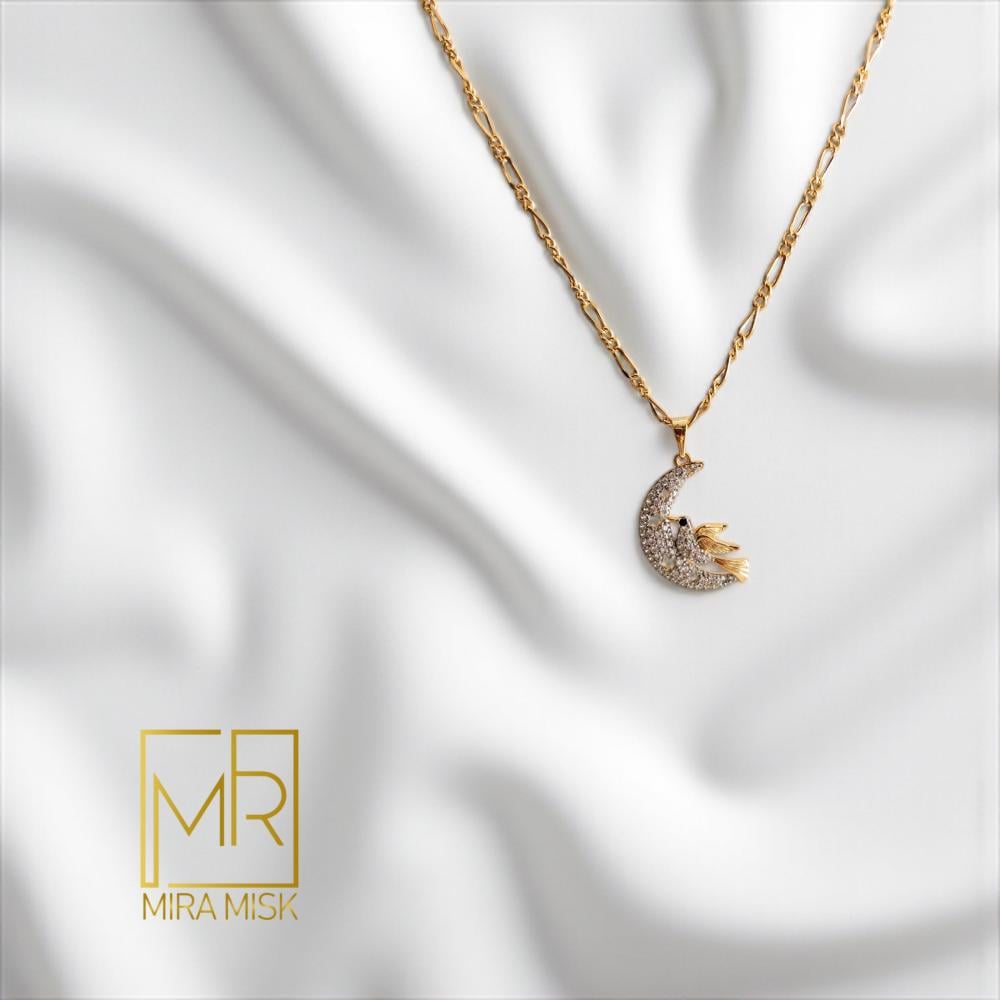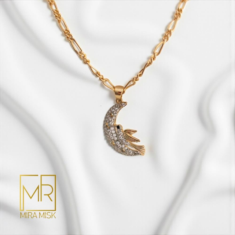 تجمع تعليقة طيف بين شاعرية الهلال وخفة العصفور في قطعة تنبض أناقة. صُنعت على قاعدة تنجستن كوري أصلي ومُطلية بذهب 21 قيراط مع ترصيع زركون مكعّب يمنح لمعانًا آسراً. سلسلتها قابلة للتعديل لتلائم طبقاتك اليومية أو إطلالات السهرة الرقيقة