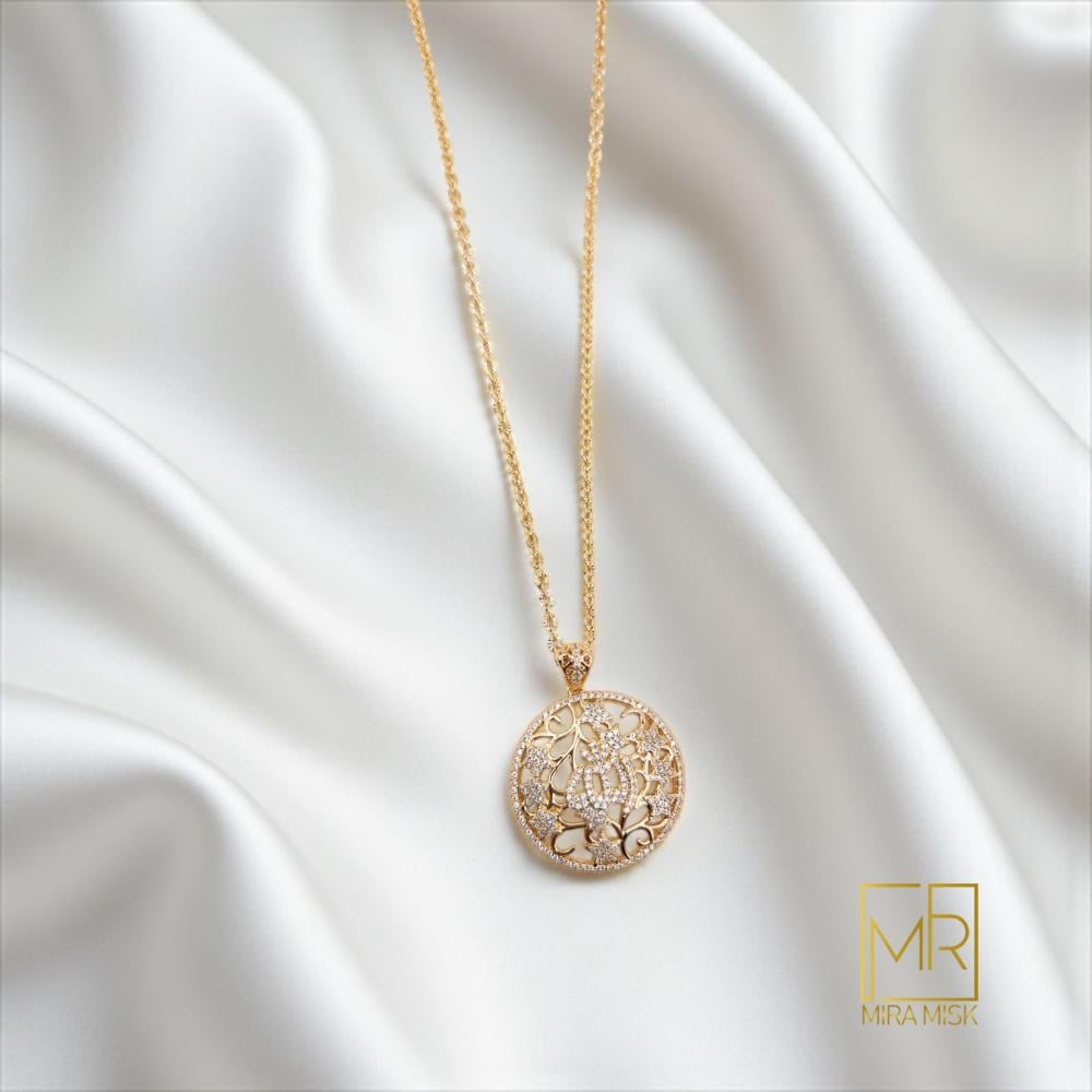 تسحر تعليقة «أميرة» الأنظار بتصميم دائري مفرغ مستوحى من الدانتيل، مرصّع بزركون برّاق يمنح وهجًا فخمًا دون مبالغة. طُليت بذهب عيار 21 بتقنية عالية مع طبقة تنجستن كوري تحافظ على اللون واللمعان لفترة أطول، وسلسلة قابلة للتعديل لملاءمة أنسب على الرقبة. قطعة أنيقة لليوم والمناسبة وتصل في علبة هدايا فاخرة من MIRA MISK