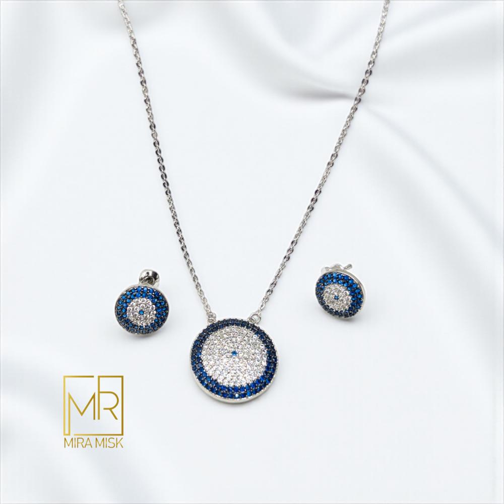 تدرّج أزرق يلفت الأنظار. يقدّم طقم عين الطيف الأزرق من زركونيا ضمن مجموعة الألوان تعليقة دائرية بنمط عين مكوّنة من حلقات micro-pavé: مركز ناعم يليه طوق زركون شفاف ثم حلقة زرقاء ملكية تمنح عمقًا بصريًا ولمعانًا غنيًا، ويكتمل الطقم بـ حلق دبوس عملي على نفس التدرّج. المظهر الفضي مع الأزرق يجعل الطقم مثاليًا لإطلالات النهار والمساء وخيار هدية مميز