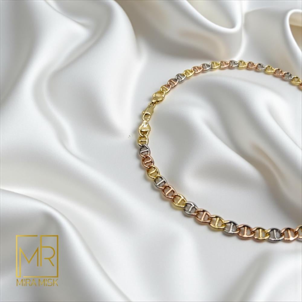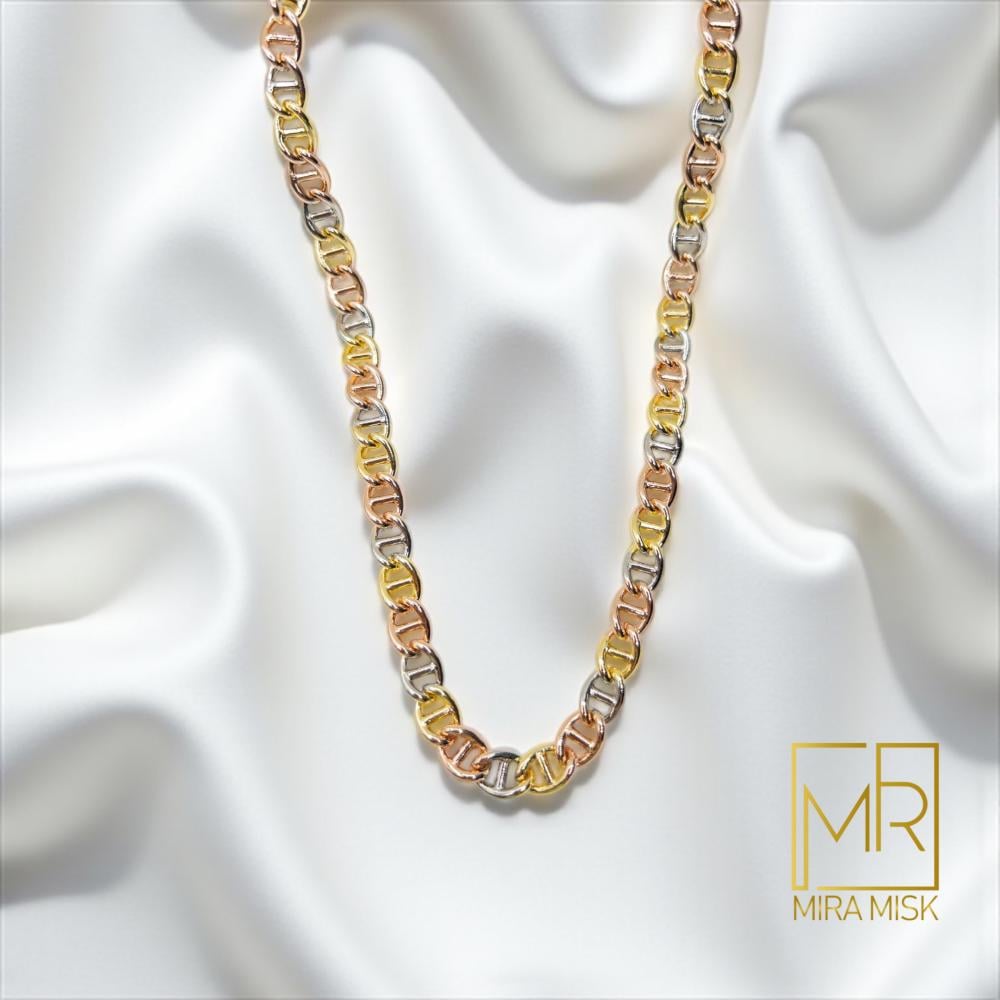 ارتقي بإطلالتك مع سلسال مربعات الألوان بتصميم روابط مربّعة الحواف تجمع الذهبي والفضي والوردي بتناغم فخم. صُنع من معدن مصقول ومعالج بتقنية التنچستون الكوري الأصلي للمساعدة على ثبات اللون والمحافظة على اللمعان لفترة أطول.