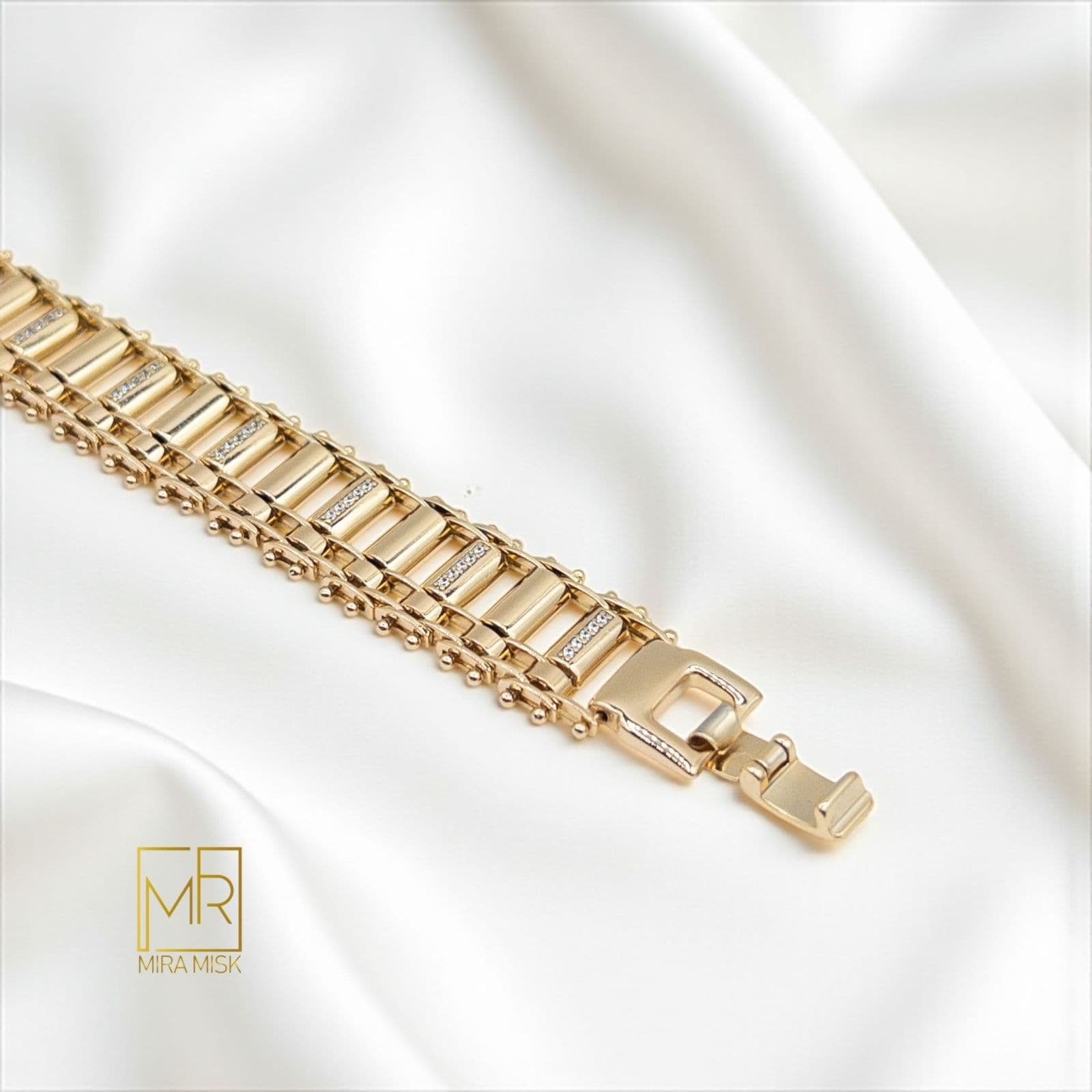 ارتقي بإطلالتك مع اسوارة وهج المربعات؛ تصميم عصري عريض يتكوّن من روابط مربعة متدرجة مرصّعة بزركون لامع يمنح معصمك بريقًا آسراً. صُنعت من تنغستون كوري أصلي لصلابة أعلى وثبات لون ممتاز، ومطلية بالذهب عيار 21 لتدوم اللمعة مع الاستخدام اليومي. قفل صندوقي آمن، ومقاسات متعددة لتناسبك تمامًا. قطعة مثالية للهدايا والمناسبات، وتنسّق بسلاسة مع ساعاتك أو أساورك الأخرى لطبقات أنيقة.