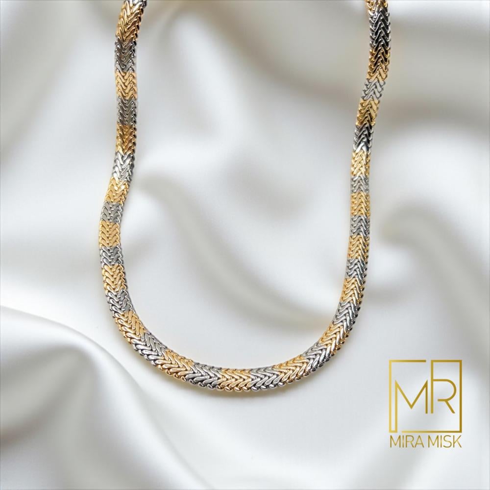 سلسلة شيفرون ثنائية البريق بستايل فاخر يجمع بين الذهبي والفضي لتوقيع إطلالة لا مثيل لها. مطلية ذهب عيار ٢١ بتقنية التنغستن الكوري الأصلي لثبات أعلى ولمعان يدوم طويلاً. تصميمها المميز “Chevron/Fishbone” يمنحك حضورًا ملفتًا سواء في الإطلالات اليومية أو المناسبات الخاصة. طولها ٤٥ سم مثالي للارتداء منفردة أو مع قطع أخرى، وعرضها العريض يعطي قوة وأناقة إضافية.