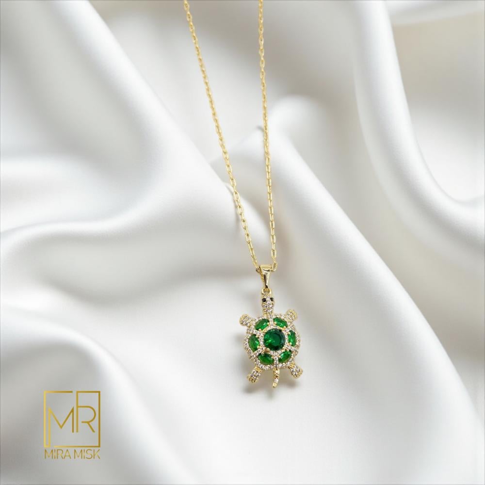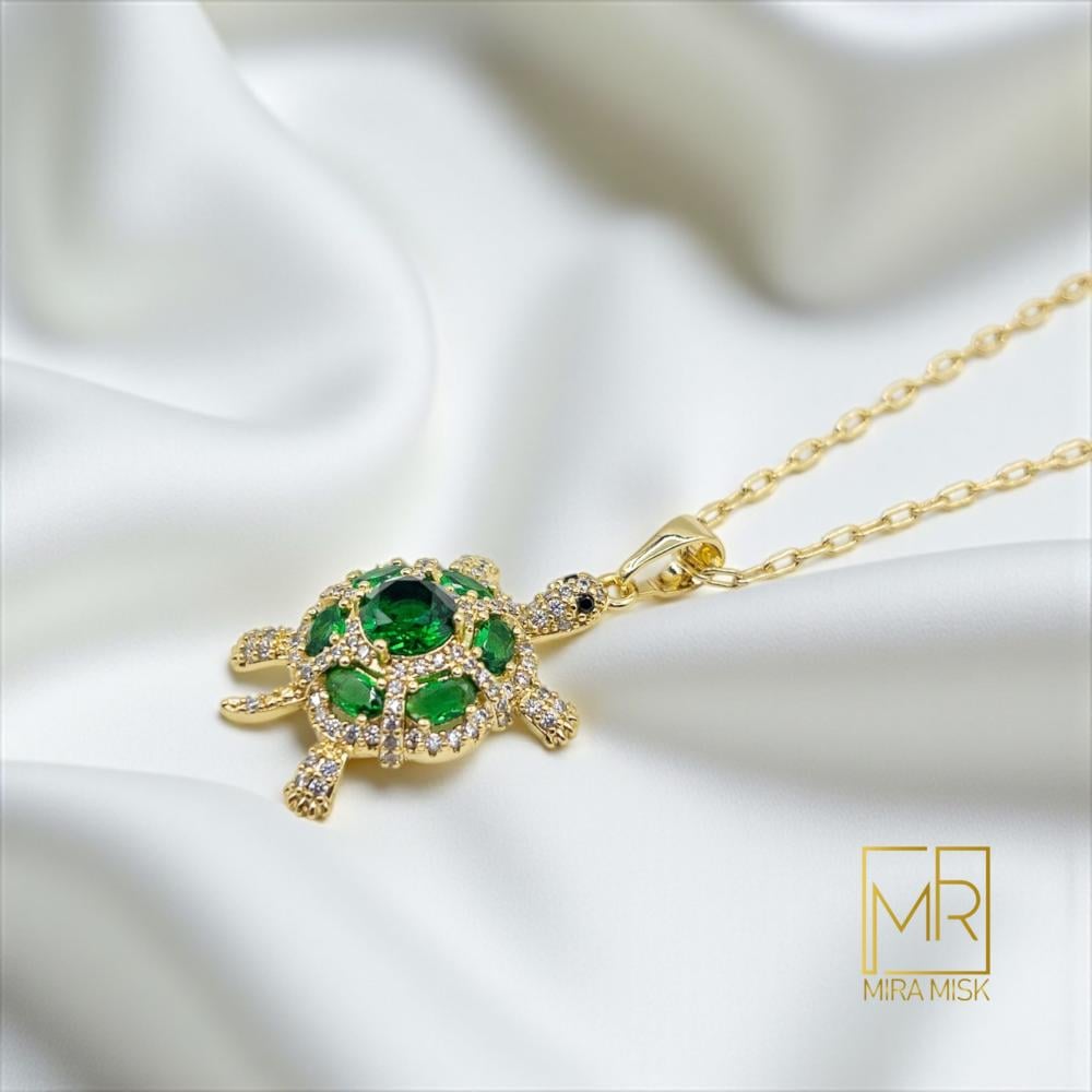 استوحت ميلان جمالها من هدوء البحر ورمزيّة السلحفاة في الحظ وطول العمر. تأتي بتصميم ثلاثي الأبعاد مزيّن بزركون أخضر بدرجة AAA يحيط به ترصيع أبيض دقيق، ومطلية بلون ذهب 18 قيراط مع طبقة حماية تنغستن كوري أصلي لمقاومة الخدش وتثبيت اللمعان. طول السلسلة 45 سم مع امتداد 5 سم لمرونة الإطلالة. قطعة أنيقة تلائم اللبس اليومي والمناسبات وتُعد خيار هدية مثاليًا