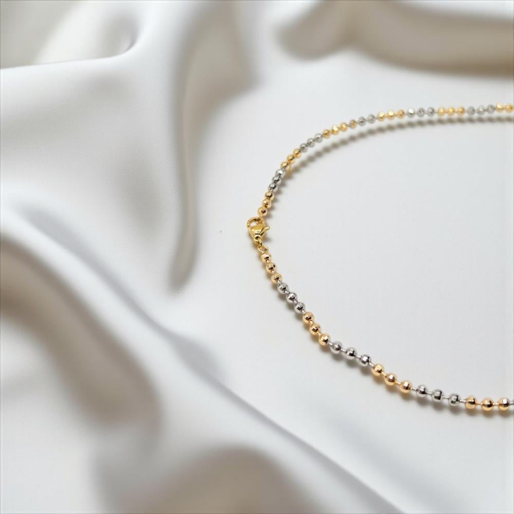 سلسلة حبات اللمعان المزدوج تجمع بين الذهبي والفضي بلمسة ناعمة تليق بكل الإطلالات. مطلية ذهب عيار ٢١ بتقنية التنغستن الكوري الأصلي لثبات لون ولمعان أطول. تصميم الخرز الدقيق ينساب برقي ويمكن تنسيقه وحده أو مع طبقات سلاسل أخرى. طولها اليومي ٤٥ سم خيار مثالي للإطلالات الكاجوال والرسمية.