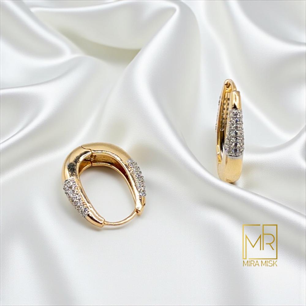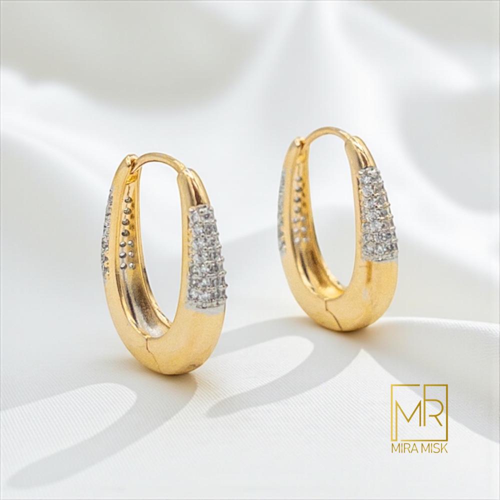 حلق مريم بتصميم هوغي بيضاوي على شكل قطرة مع ترصيف زركون متدرّج يمنح وهجًا رقيقًا ولافتًا في آنٍ واحد. القاعدة تنغستن كورية لصلابة أعلى وثبات لون، مع طلاء ذهب عيار 21 ولمعة حريرية مريحة للّبس اليومي. إغلاق هوغي ثابت وخفيف على الأذن، ويصل في علبة هدية أنيقة من Mira Misk.