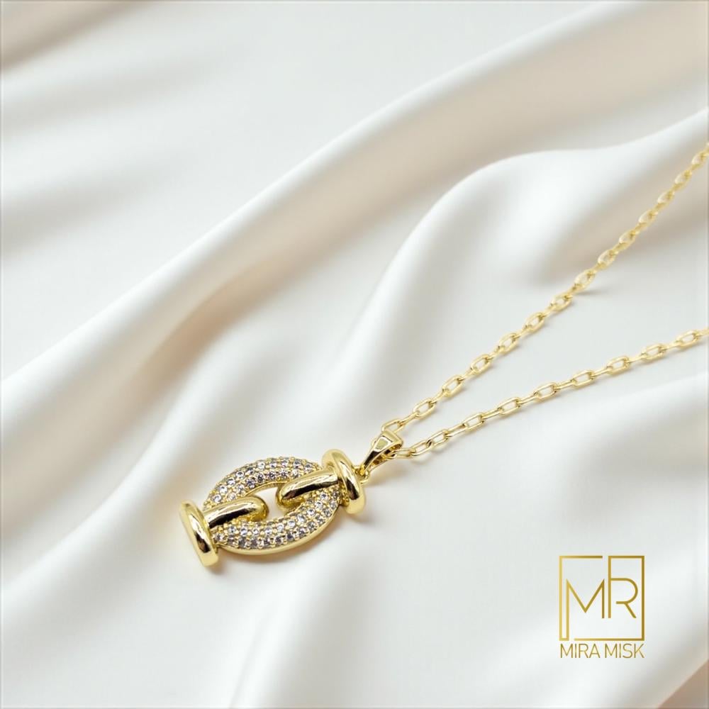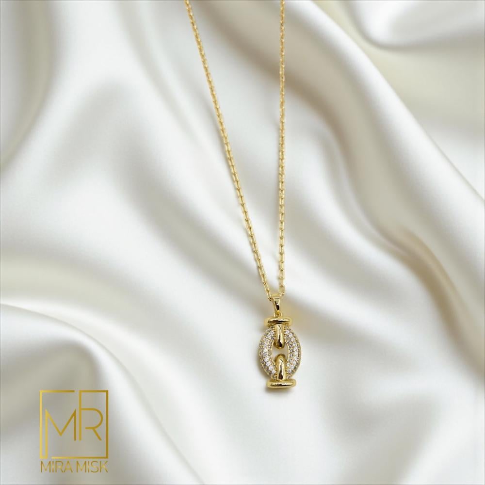 تعليقة تالا من ميرا مسك بتصميم رابط بيضاوي عصري مرصّع بزركون لامع، مطلية بلون ذهب عيار 18 ومحميّة بتقنية التنغستن الكوري لمتانة ولمعان أطول. طول السلسلة 45 سم مع امتداد 5 سم لتناسب جميع الأعناق، وتفاصيل دقيقة تمنحك لمسة فاخرة تلائم الإطلالات اليومية والمناسبات